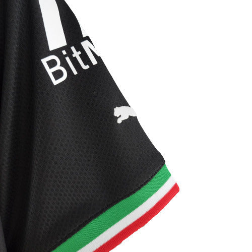 O escudo do Milan é aplicado no lado esquerdo, dentro de uma faixa preta, enquanto no lado direito, o logo da PUMA é aplicado em branco, cor também vista no patrocínio máster que no modelo masculino é da Emirates, e no feminino, do Banco BPM, e também no de manga.