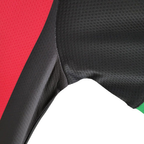 A gola traz uma construção especial, sendo preta com detalhe frontal vermelho, já as mangas são totalmente pretas com os punhos listrados com as cores da bandeira da Itália.