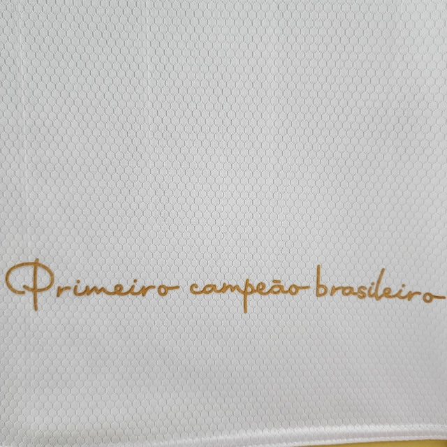 Na parte inferior do manto, a barra é dourada, enquanto a frase “Primeiro campeão brasileiro” é aplicada acima. Já nas costas, o ano “1959”, ano da conquista, se completa, aparecendo na nuca.
