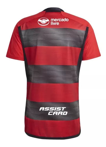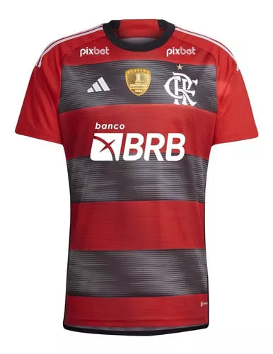 A nova camisa titular do Flamengo traz tradicionais listras horizontais rubro-negras com um efeito que traz finas linhas também horizontais formando um degrade em “tom sobre tom”. A gola é redonda na cor preta, assim como as laterais do kit, por outro lado, as mangas e os punhos são vermelhos. Inspirada pelo movimento perpétuo no campo e nas arquibancadas, esta camisa do mengão funde as cores tradicionais do clube com um gráfico com falhas. Criada para manter os torcedores confortáveis, inclui AEROREADY que absorve a umidade e tecido liso. Esse distintivo tão importante é feito com tecido para uma sensação premium.