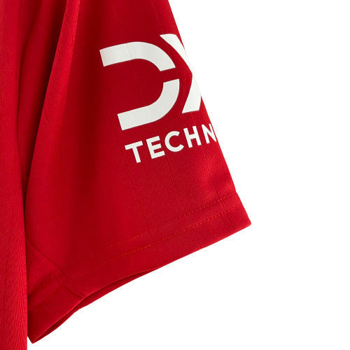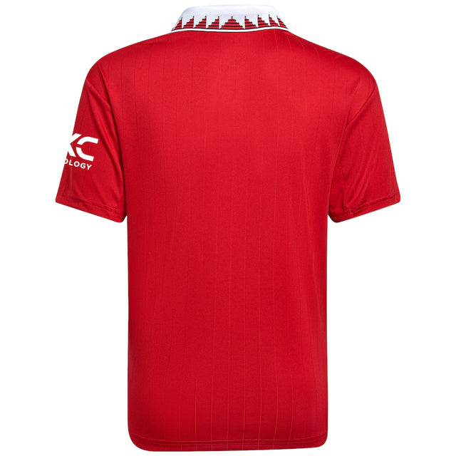 A Adidas estampa seu logo em branco, com contorno preto, no lado direito do peito, enquanto o escudo do Manchester United é colocado no lado esquerdo, em sua versão atual padrão, sobre um brasão.